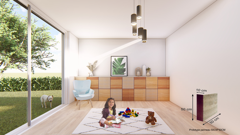 Rammed earth panels used in interior design for cladding but also for hygrothermal regulation. Raw earth is the best material for regulating interior humidity.