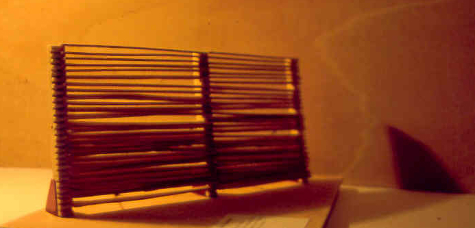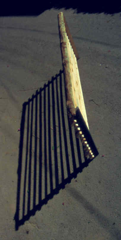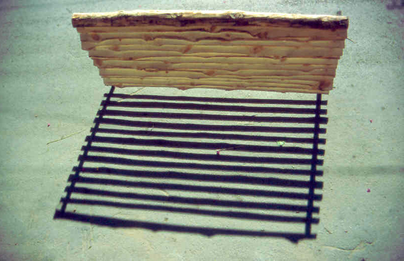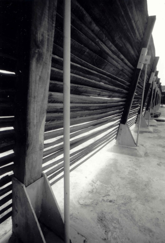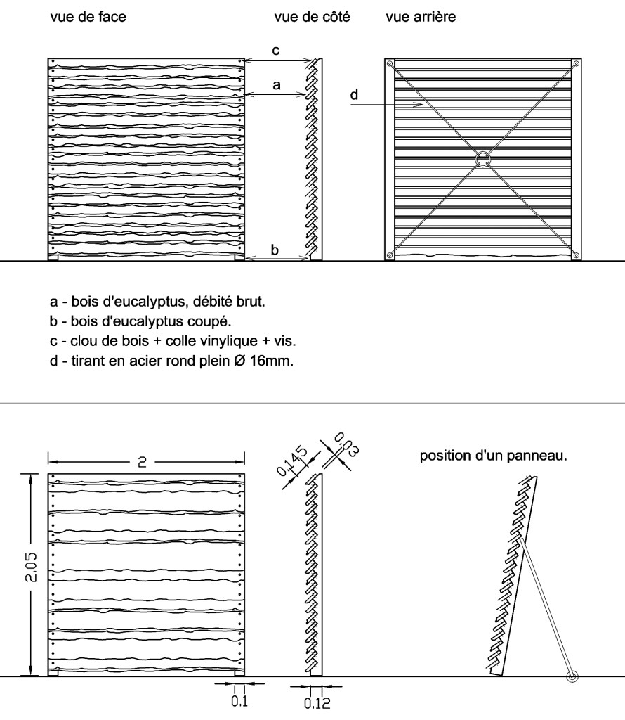« Jalousie » partition allowing the wind (very strong exposure) to pass but not the view, made of local eucalyptus wood.